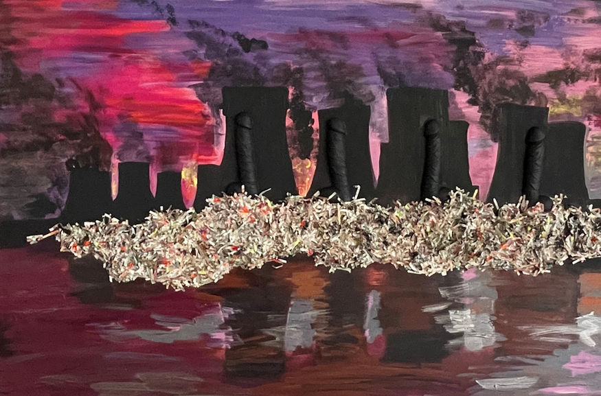 2022 veranschaulicht der Farbwechsel ihrer neuesten Werke von Weiß auf Schwarz den Schmerz über die um sich greifende Zerstörung. Die Gier nach Macht und Besitz macht vor nichts halt und nimmt die grausamsten Opfer in Kauf. Monika Stahl entblößt die verheerenden Auswirkungen des Neoliberalismus der patriarchalen Systeme, indem sie Phalli in den Collagen verwendet, als Symbol der maskulinen Übermacht in der Welt des Geldes.